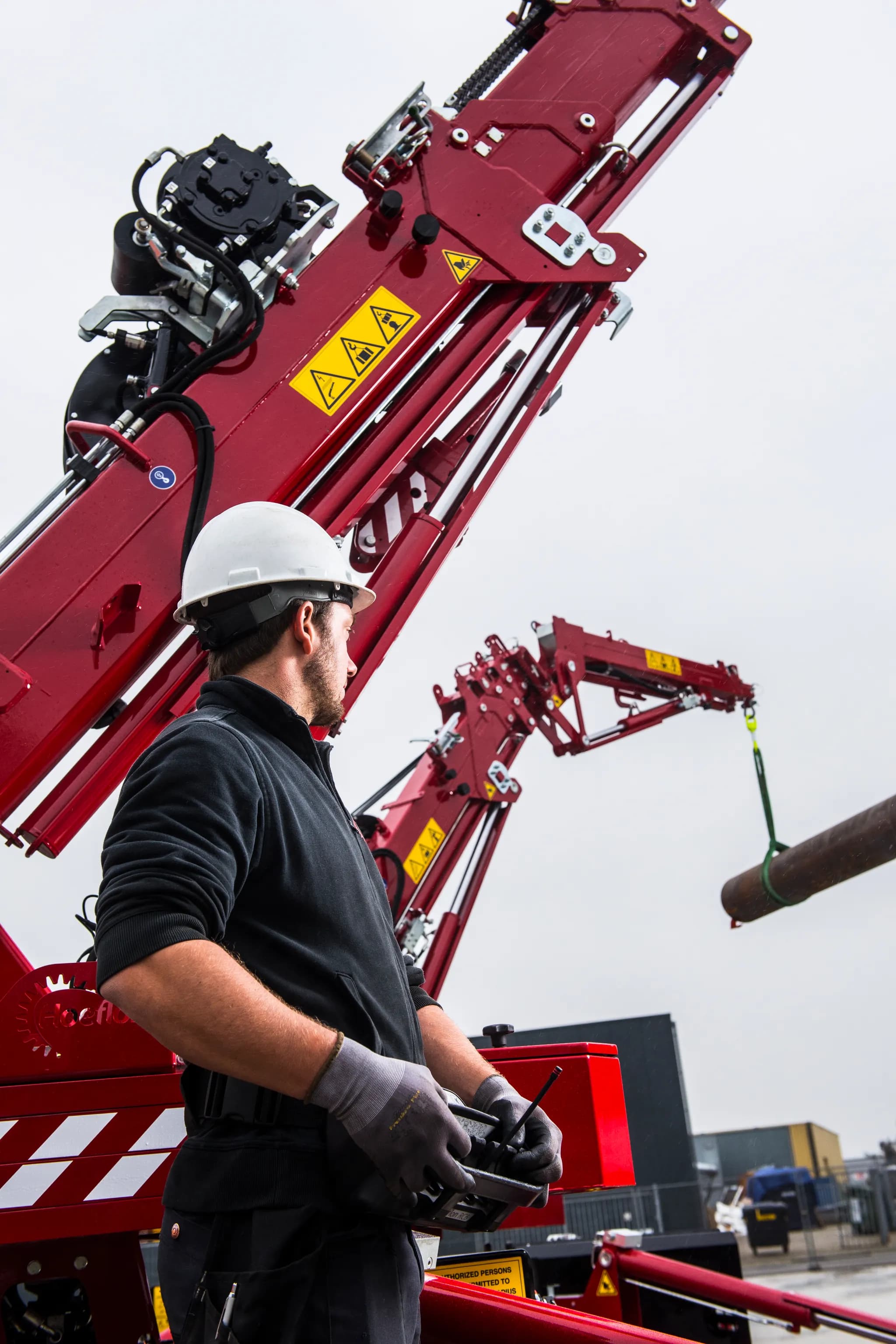 Toutes les grues Hoeflon sont équipées de série d'une télécommande sans fil, vous permettant de les piloter à distance. Cela vous offre une visibilité optimale et vous permet de travailler en toute sécurité. Vous n'avez même pas besoin d'être à l'intérieur de la grue.