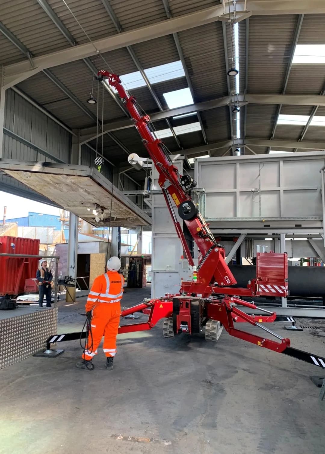 Les opérations de levage en intérieur exigent une maîtrise absolue. Le C10 offre cette stabilité grâce à ses stabilisateurs, ses commandes précises et sa capacité de levage fiable. L'équipe a ainsi pu travailler en toute sécurité, même lors de la manutention de charges très lourdes.