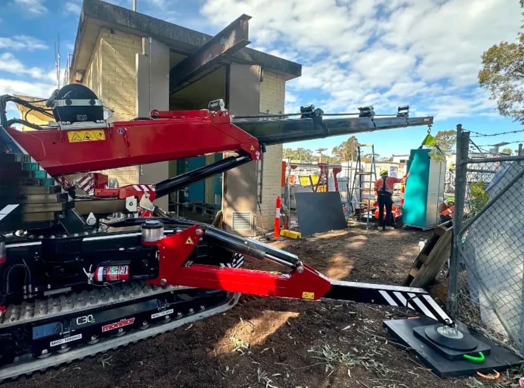 Pour un projet d'installation en Australie, Rise Pacific a déployé le Hoeflon C30e pour installer de lourdes armoires VSD. Le principal défi résidait dans l'espace de travail extrêmement restreint : les passages étroits et les marges réduites rendaient impossible l'utilisation de grues conventionnelles.