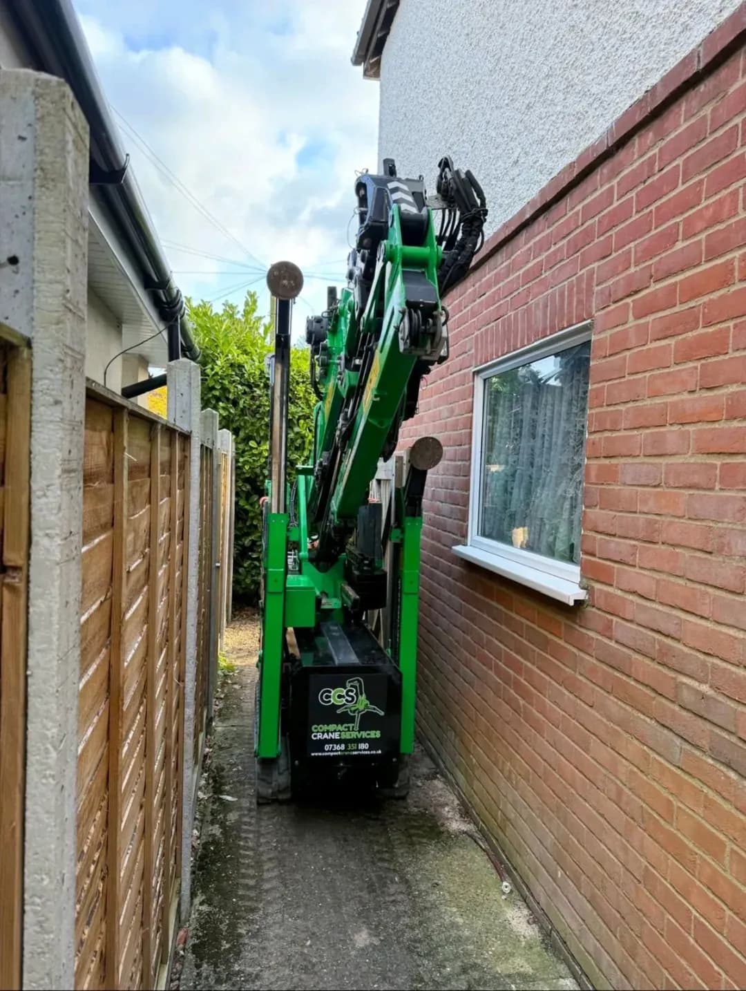 Dans ce projet, Compact Crane Services a démontré les capacités de la Hoeflon C6e. La grue a dû manœuvrer dans un passage étroit pour atteindre l'arrière-cour : un défi qu'une grue traditionnelle n'aurait tout simplement pas pu relever.