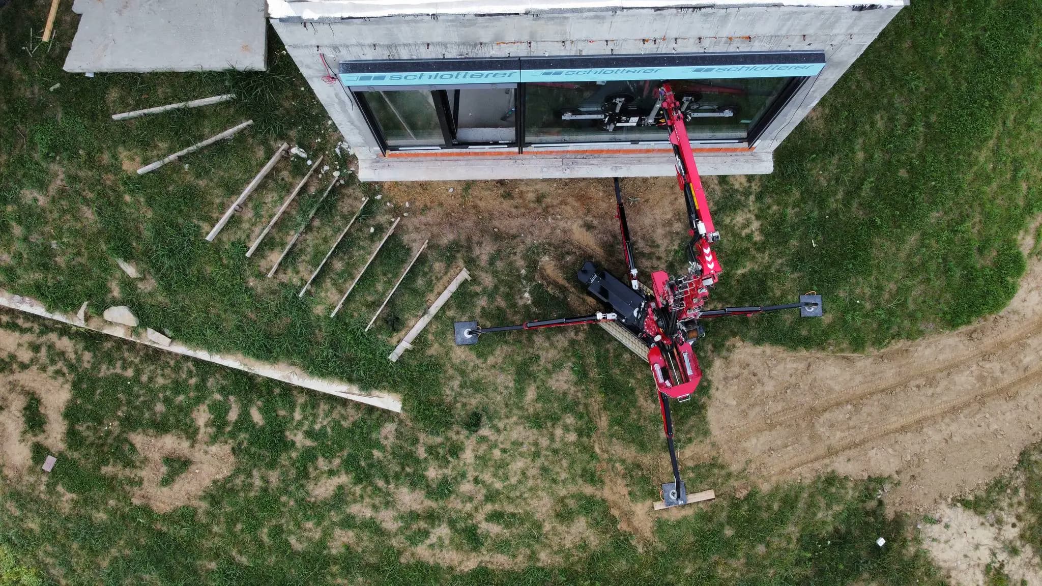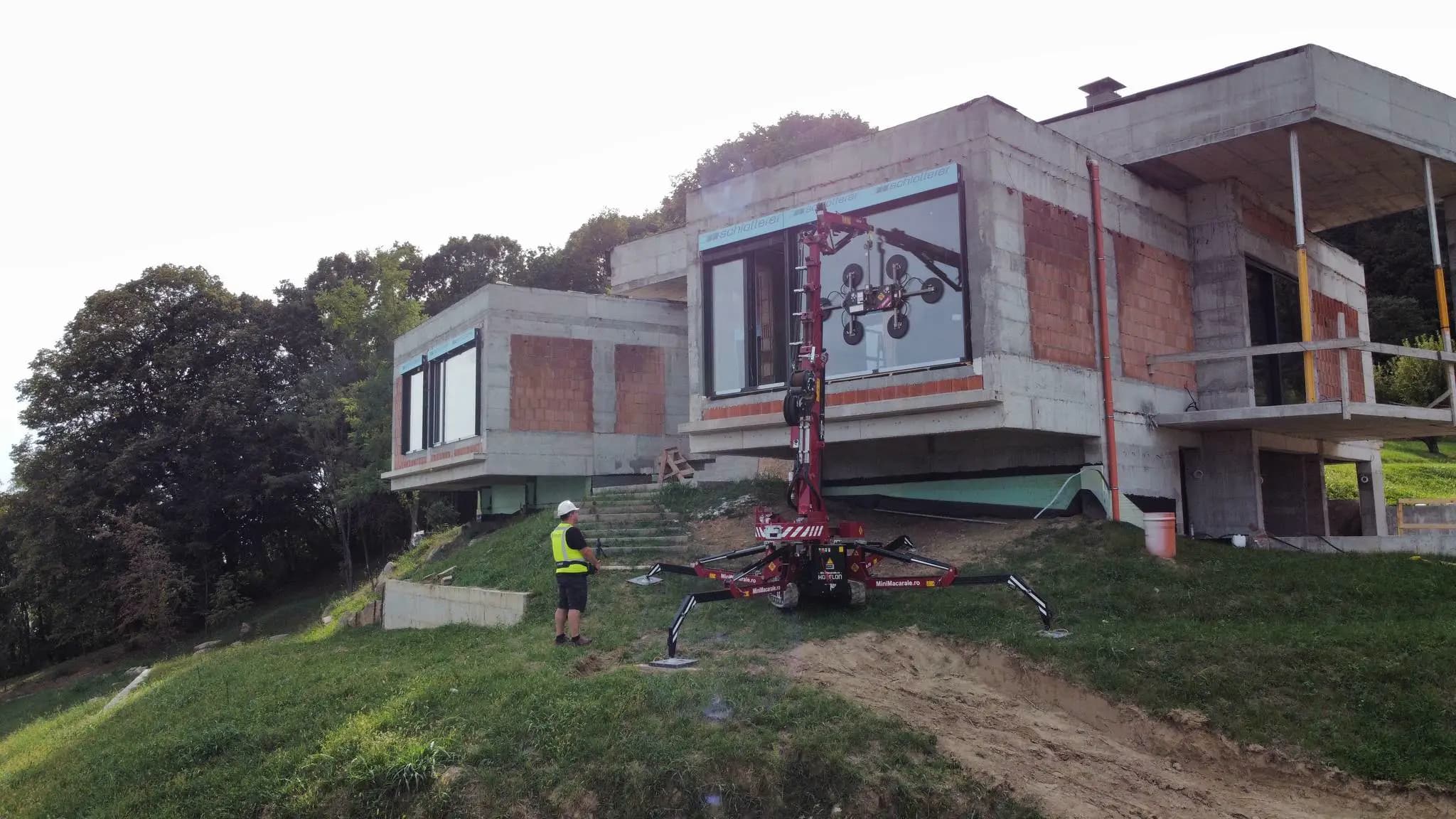 Une installation vitrée impeccable en Roumanie avec le Hoeflon C6e de Minimacarale. Le positionnement flexible sur cette pente et la manipulation simple et précise garantissent une installation du verre sans effort.